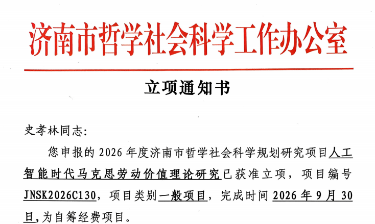 史孝林老师申报的《人工智能时代马克思劳动价值理论研究》、程诚老师申报的《人工智能时代高校思政教师的知识结构 “适配性困境”与数字胜任力建构研究》获批立项。