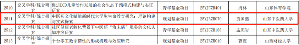 教师贾国燕《中医药文化赋能新时代大学生生命教育研究:理论构建与实践探索》获教育部人文社会科学研究一般项目立项。